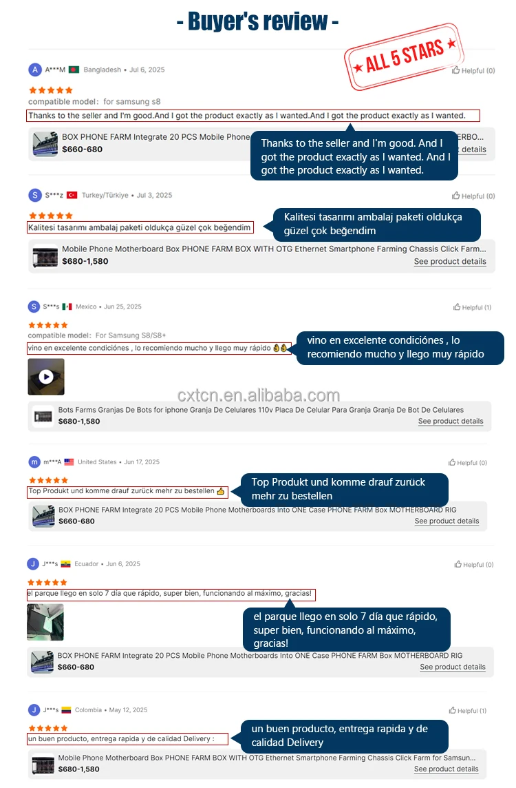 仅提供用于开发或测试的盒子。请勿用于非法用途。产品描述及包装清单:每个盒子包含硬件(20块手机主板、USB数据线、盒子电源线、手机主板+高级控制管理软件(15天免费试用,之后每年38美元),软件可从我们的网站下载(视频中有演示)。什么是盒子手机农场?它是一种将手机屏幕/电池/摄像头/SIM卡槽拆卸下来,集成到一个机箱内,并配合ClickFan软件实现群控功能的设备。每个盒子包含20块手机主板。盒子尺寸和主板数量固定。在您的电脑上安装ClickFan软件即可进行批量操作。功能:在您的电脑上安装ClickFan软件,即可批量操作设备或单独操作每部手机。一人即可同时控制20部手机,执行相同任务或分别执行不同任务,轻松构建数千部手机的网络矩阵。只要是手机用户参与的线上项目,他们就可以参与控制。电压支持110V-220V,即使游戏持续运行,单机功耗也仅约100瓦。您可以使用VPN或代理来更改您的IP地址。以太网:[OTG/LAN] 可使用USB模式,也可以使用路由器的网线连接盒子。两种连接方式可以切换。【设备参数】纸箱尺寸:55*38*16cm,重量:约7KG。手机盒为定制组装产品,发货后不可退换,直接进入售后阶段。